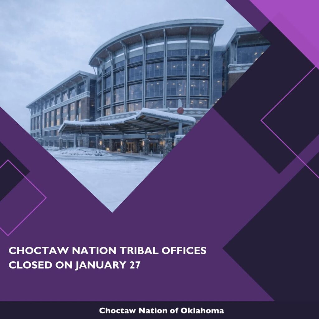 All Choctaw Nation tribal offices will be closed on Monday, January 26, due to inclement weather in the CNO service area. Tribal offices will be working virtually and remain available to provide assistance throughout this weather event and can be reached at 1-800-522-6170.
