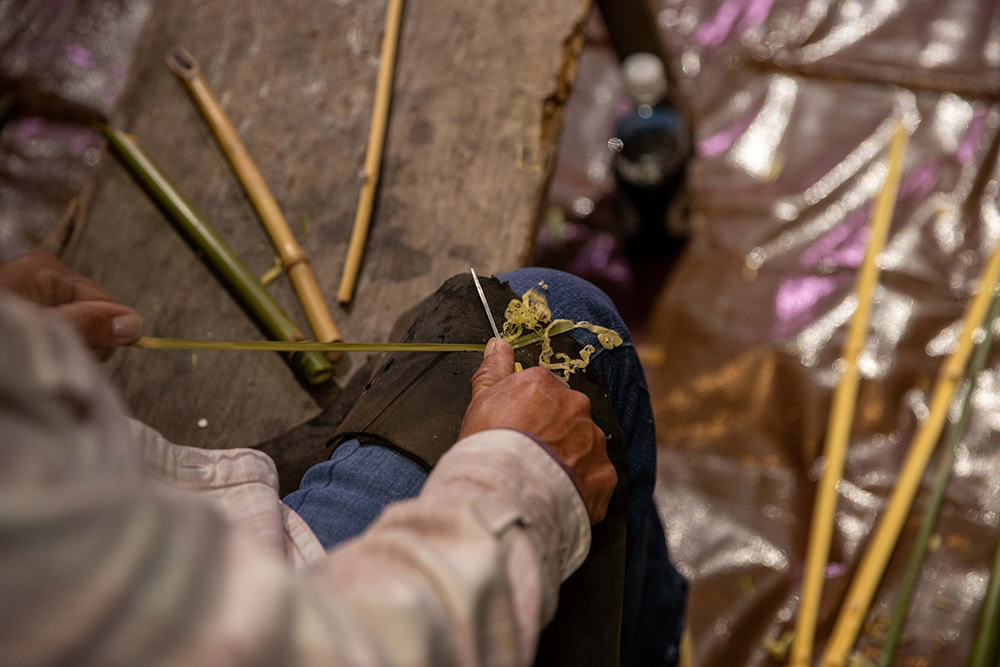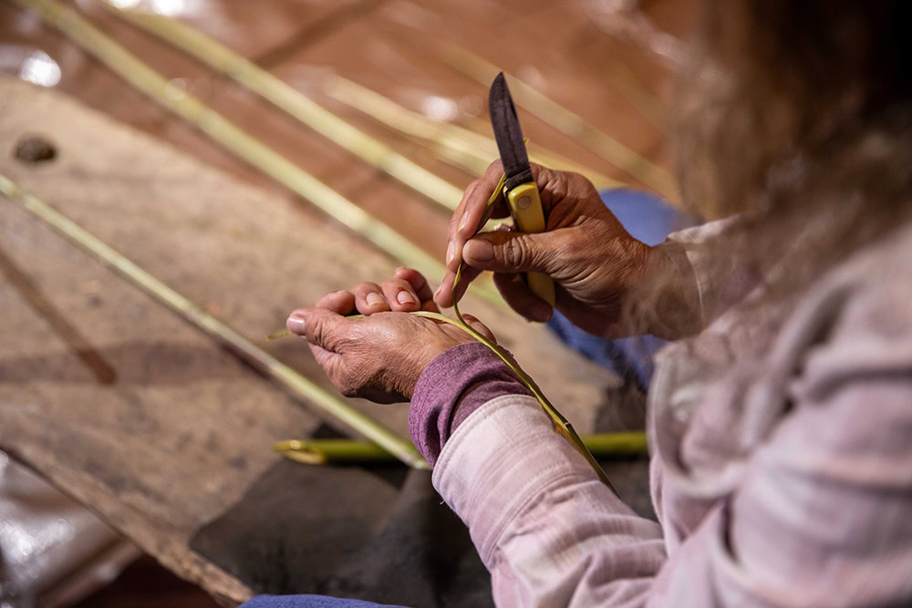 Basketmaking can begin with green cane, or the strips can be dried, a process that may take up to a year. When the artist reaches their desired strip color and texture, they begin weaving the basket.